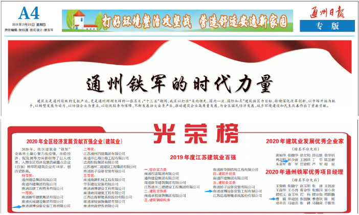 2020年,在董事会的正确领导和执行层的努力拼搏下,公司全体员工团结一心,努力克服新冠肺炎疫情的影响,坚持稳中求进,积极开拓市场,推进科技创新,取得了骄人的业绩。公司再次荣获“南通市通州区经济发展贡献百强企业”一等奖,董事长邱少波荣获“2020年度建筑业发展优秀企业家”,副总工程师曹震荣获“2020年度通州铁军优秀项目经理”。新年伊始,公司将认真贯彻通州区委十二届十一次会议精神,攻坚克难,砥砺奋进,再创辉煌。